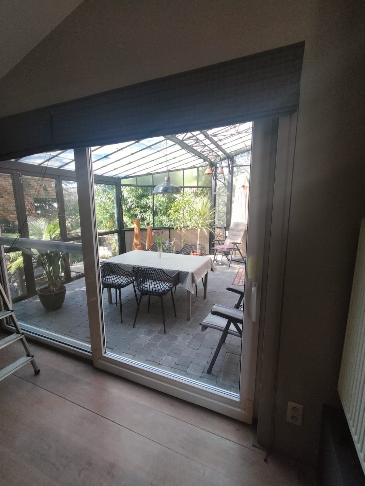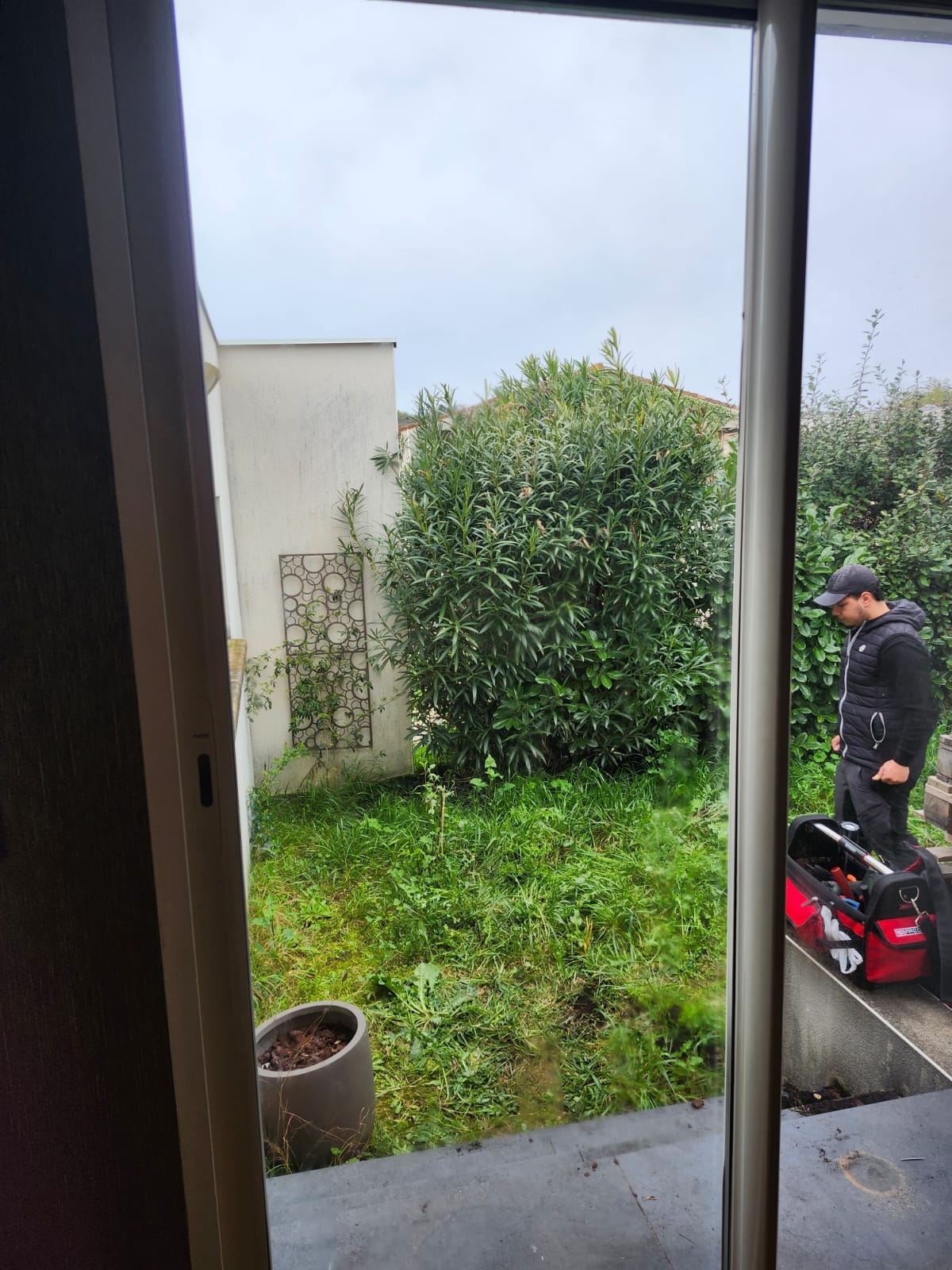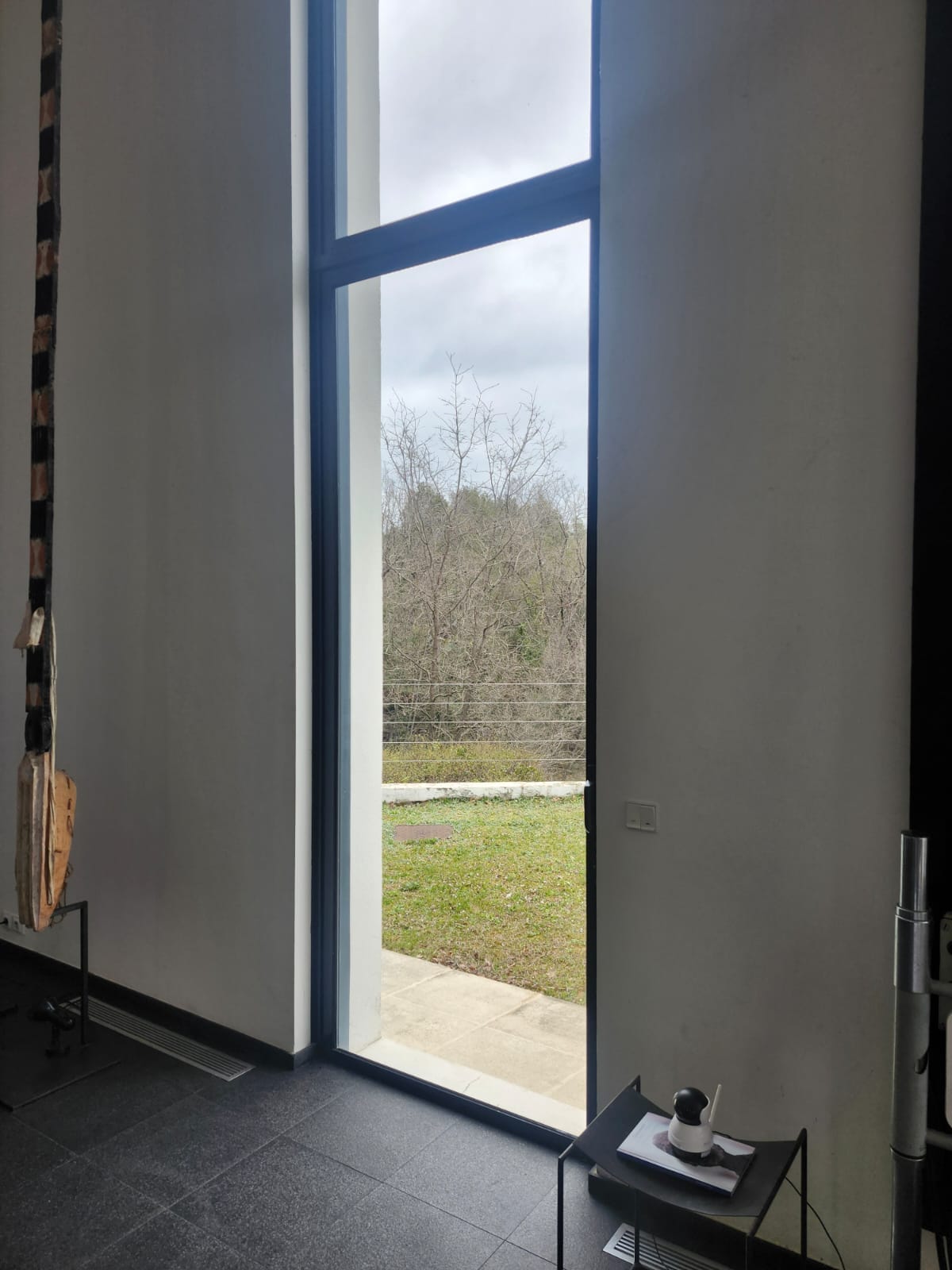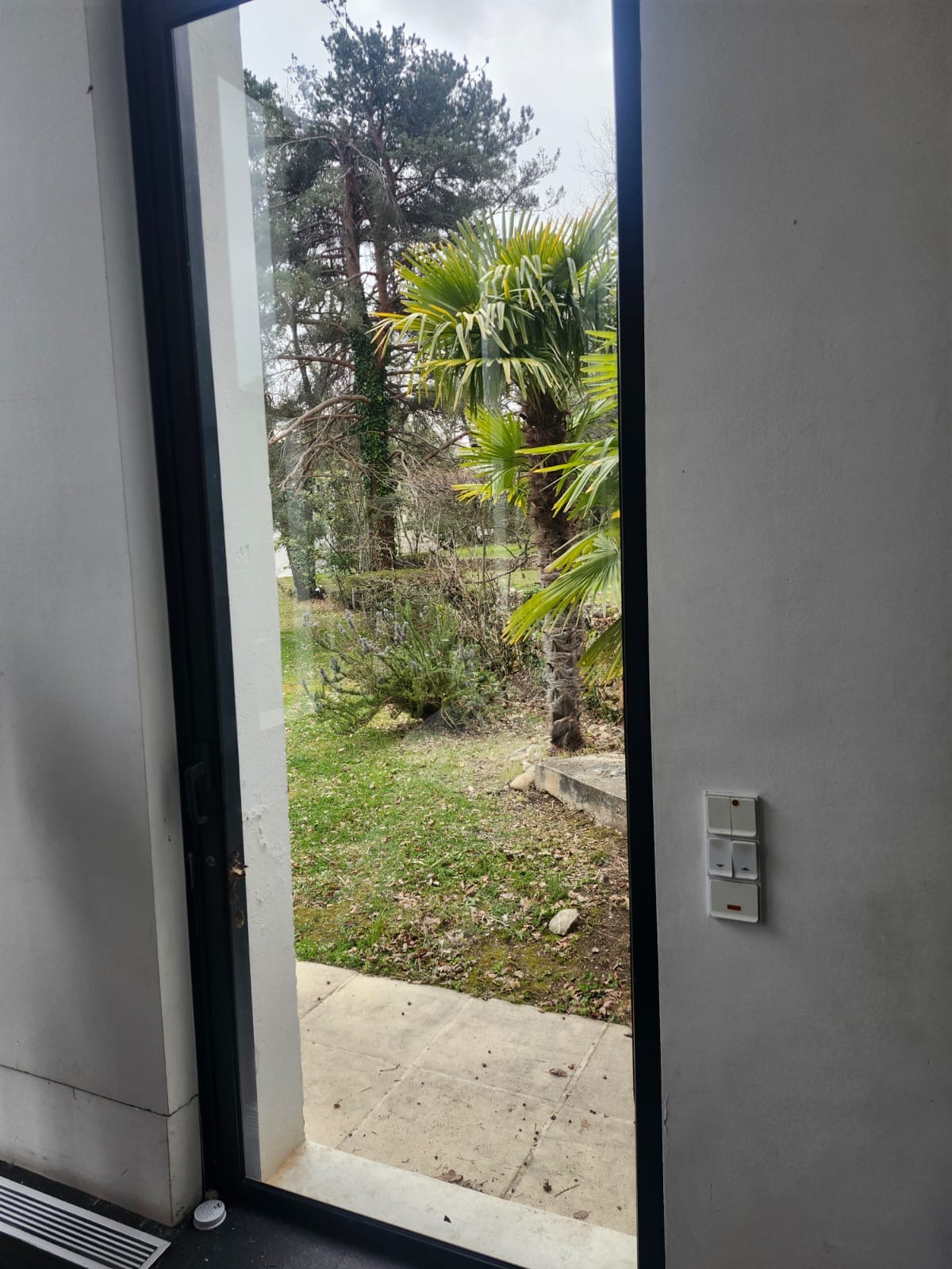 Through a partially open glass door, indicating possible windows and door repair issues, a view of a secluded courtyard with wild grass