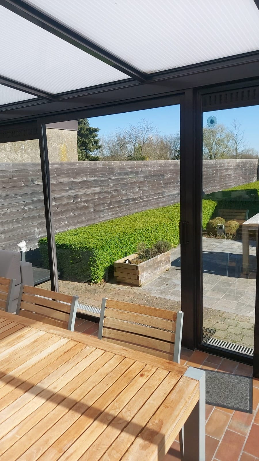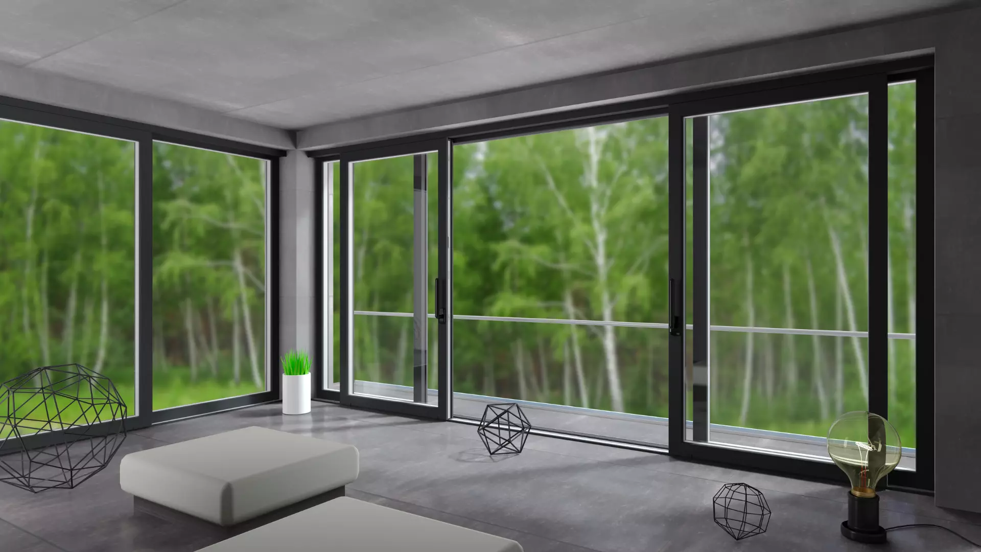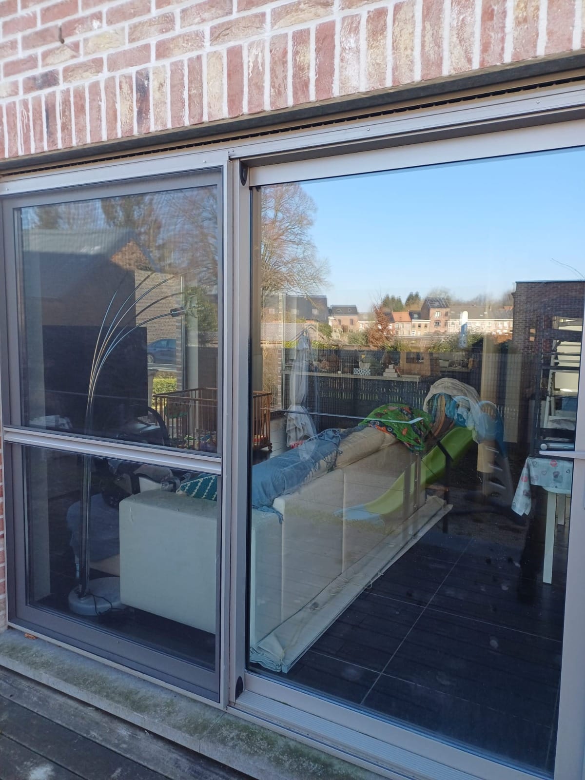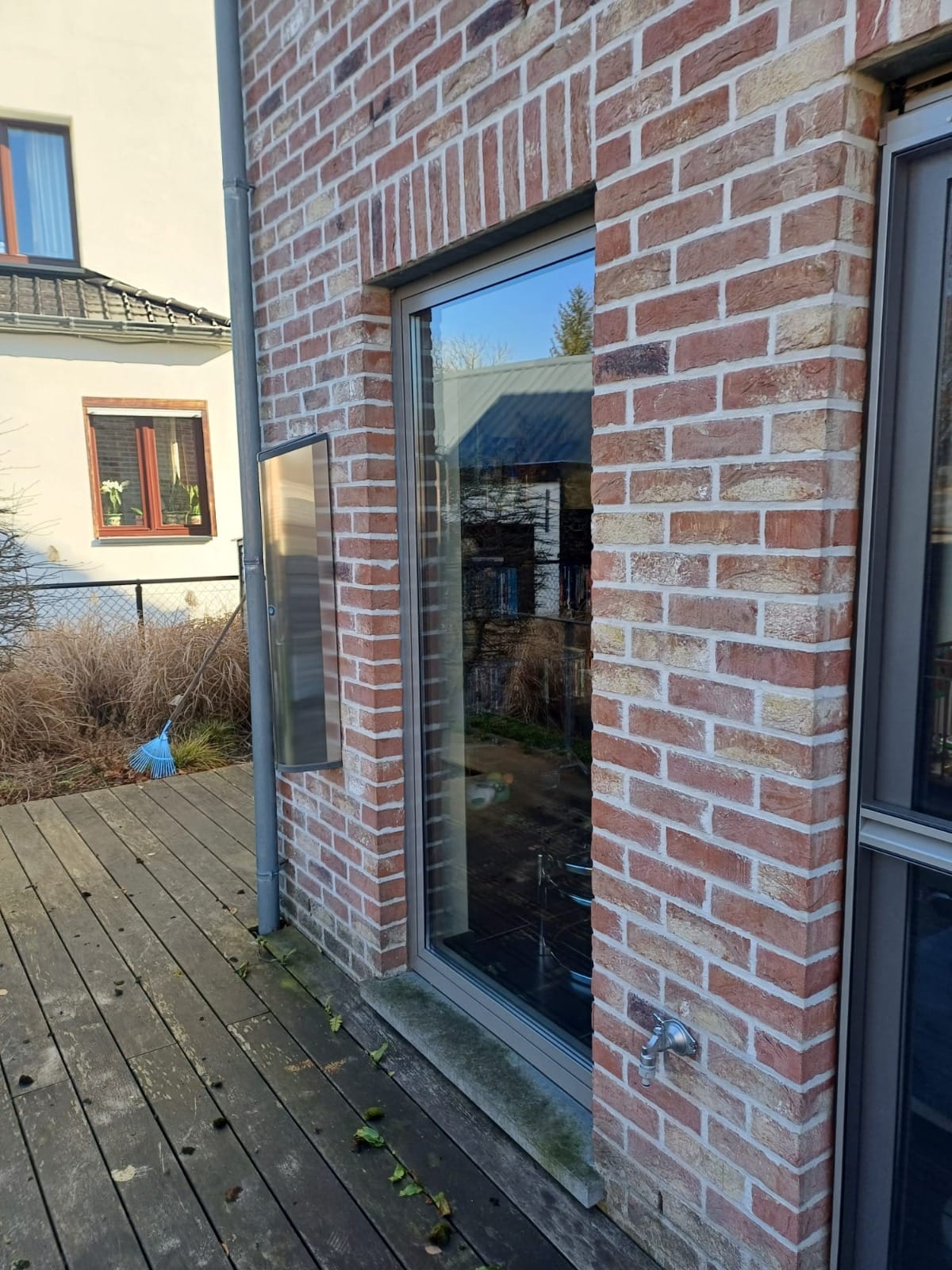 Through a partially open glass door, indicating possible windows and door repair issues, a view of a secluded courtyard with wild grass
