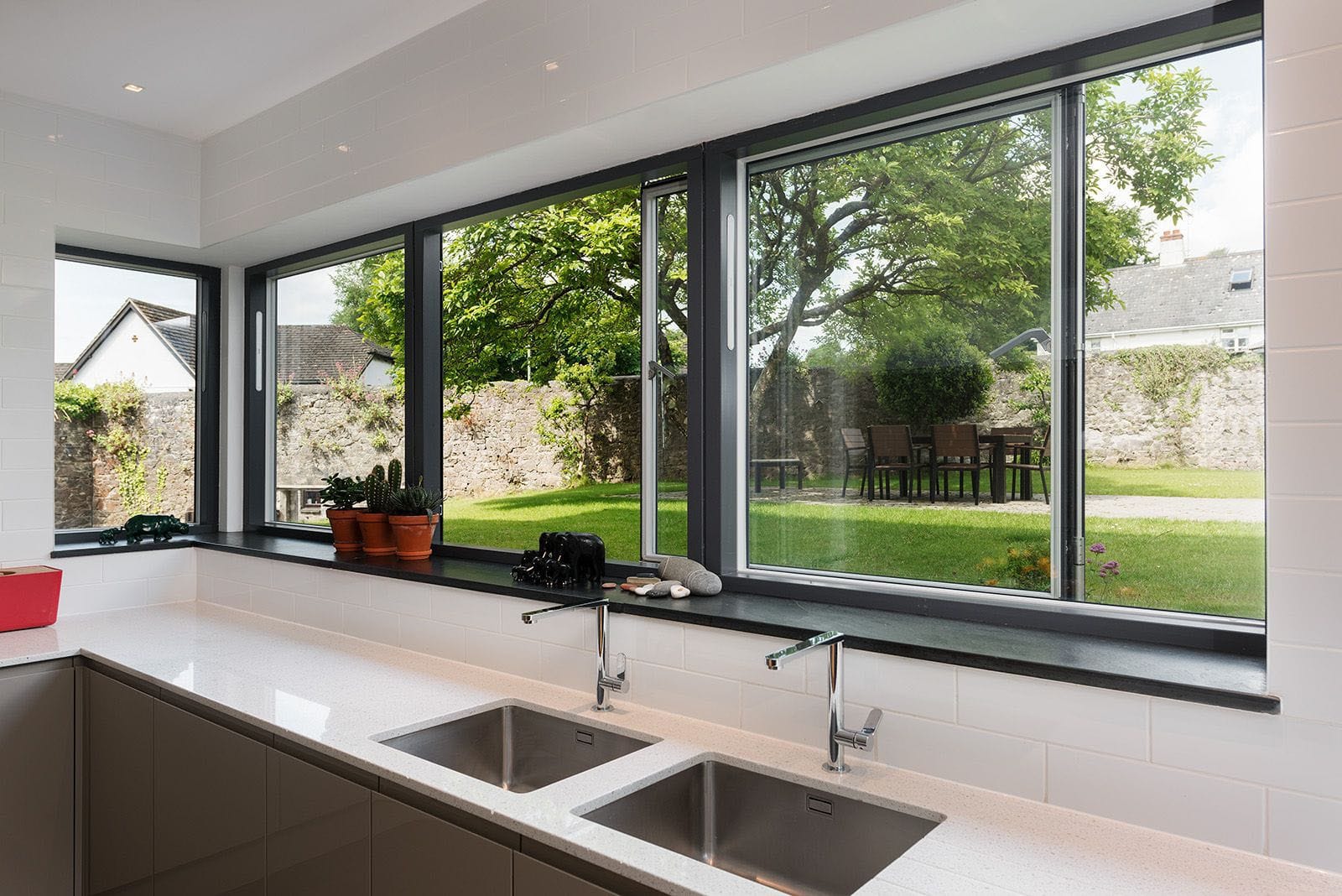 Indoor view looking out to a small, private courtyard with unkempt grass, a modern round planter, and a glimpse of the sky through a window