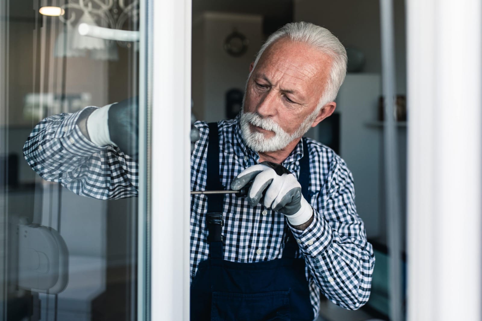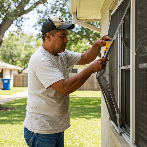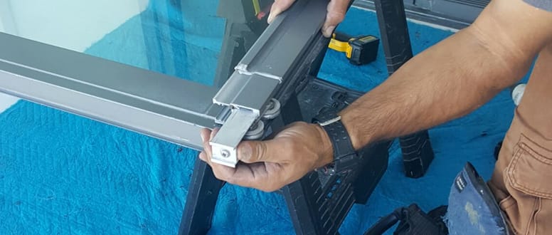 Close-up view of someone repairing the rollers on a Sliding Glass Door Repair Houston