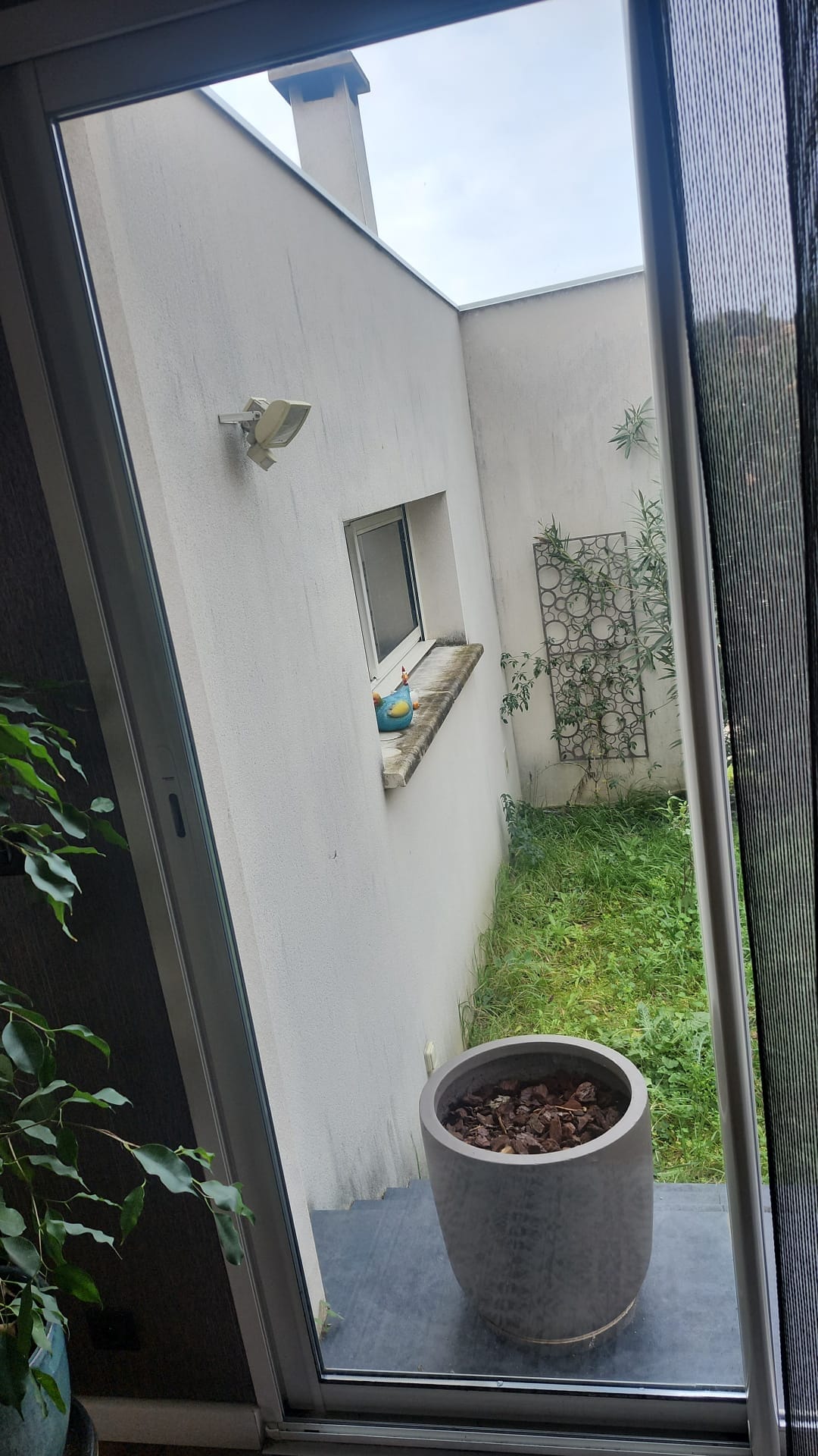 A view through a glass door, suggesting potential windows and door repair needs, into a small, enclosed courtyard with overgrown grass, a potted plant