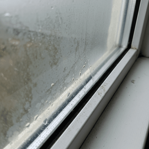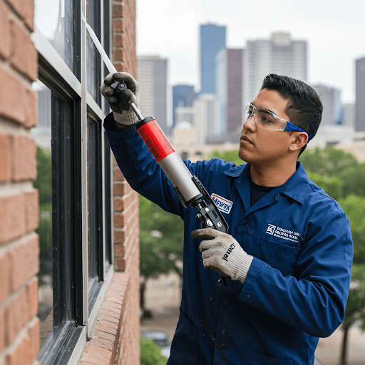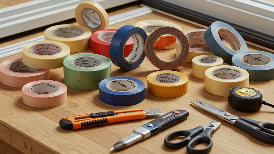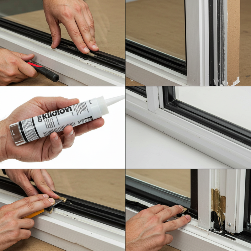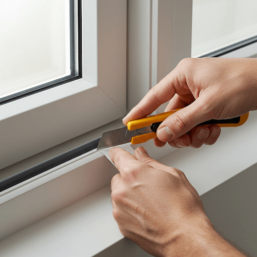 Hands installing window sealing tape along a clean window frame with a utility knife