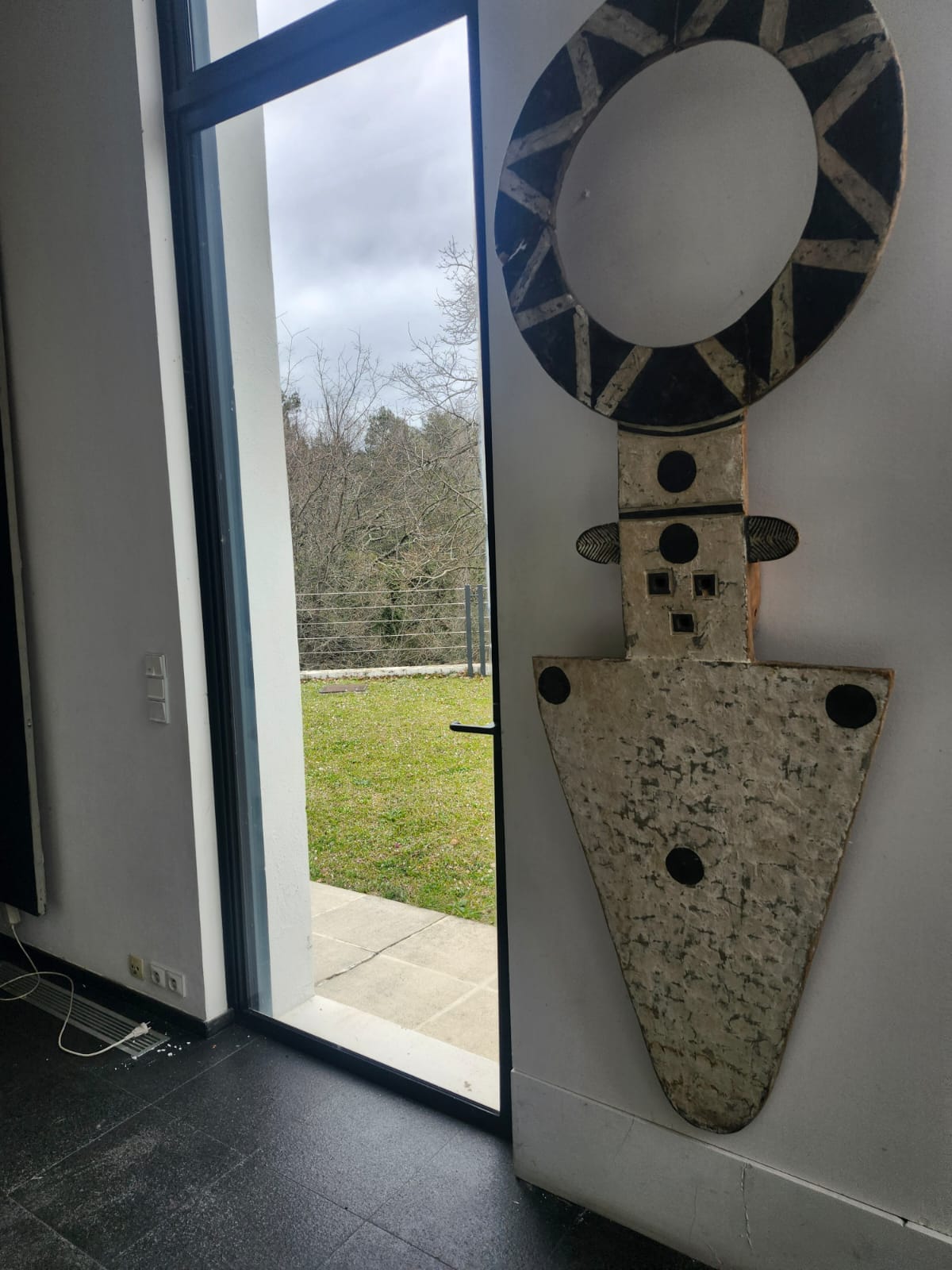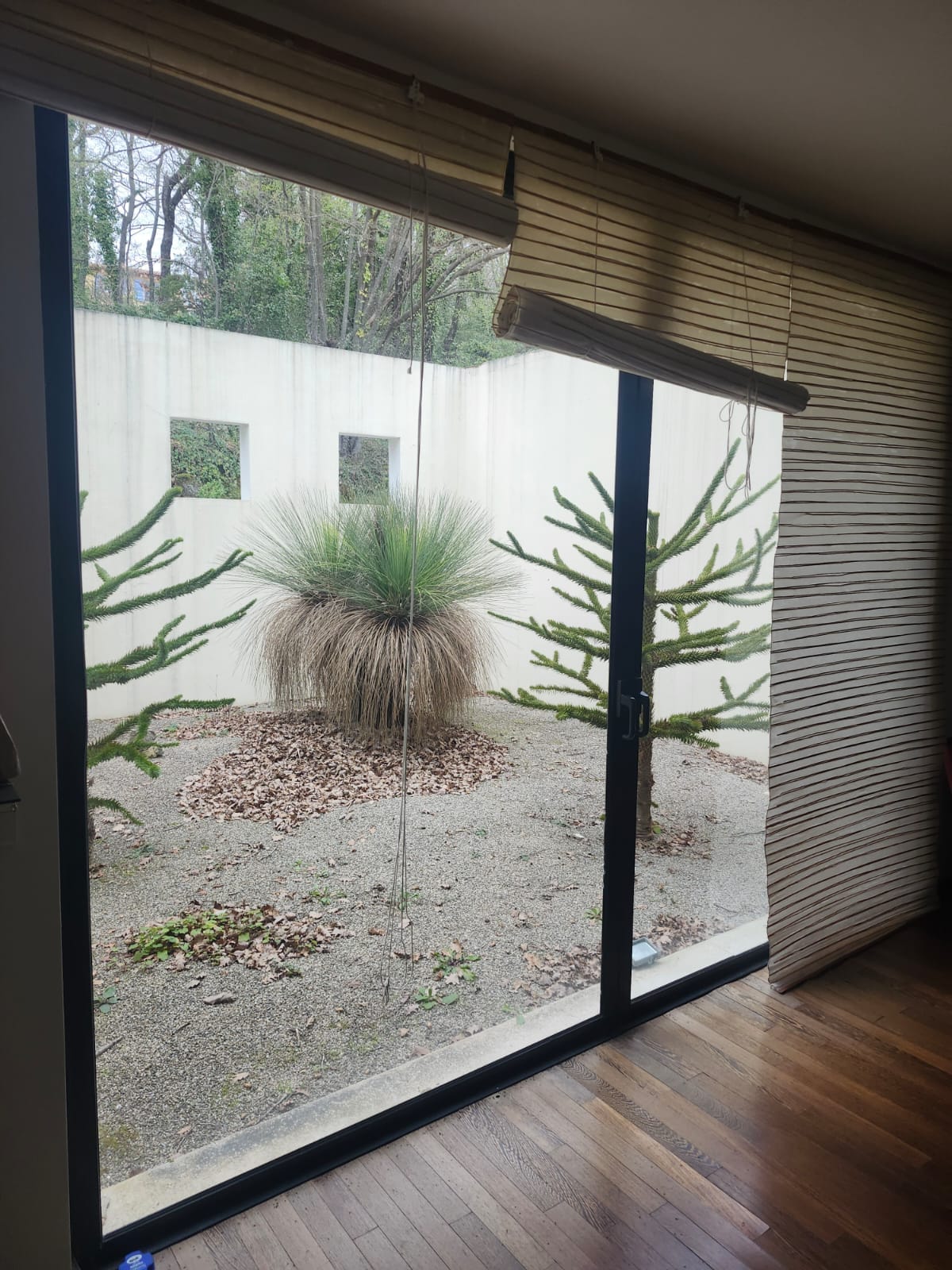 View from inside a building looking out at a small, walled courtyard where tall grass grows freely around a modern, round plant pot, with the visible window and door potentially requiring windows and door repair in Austin